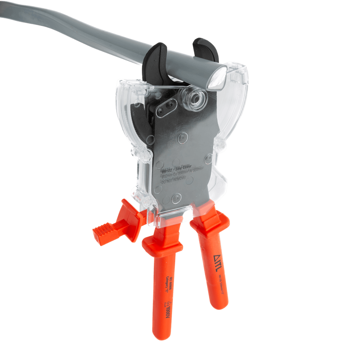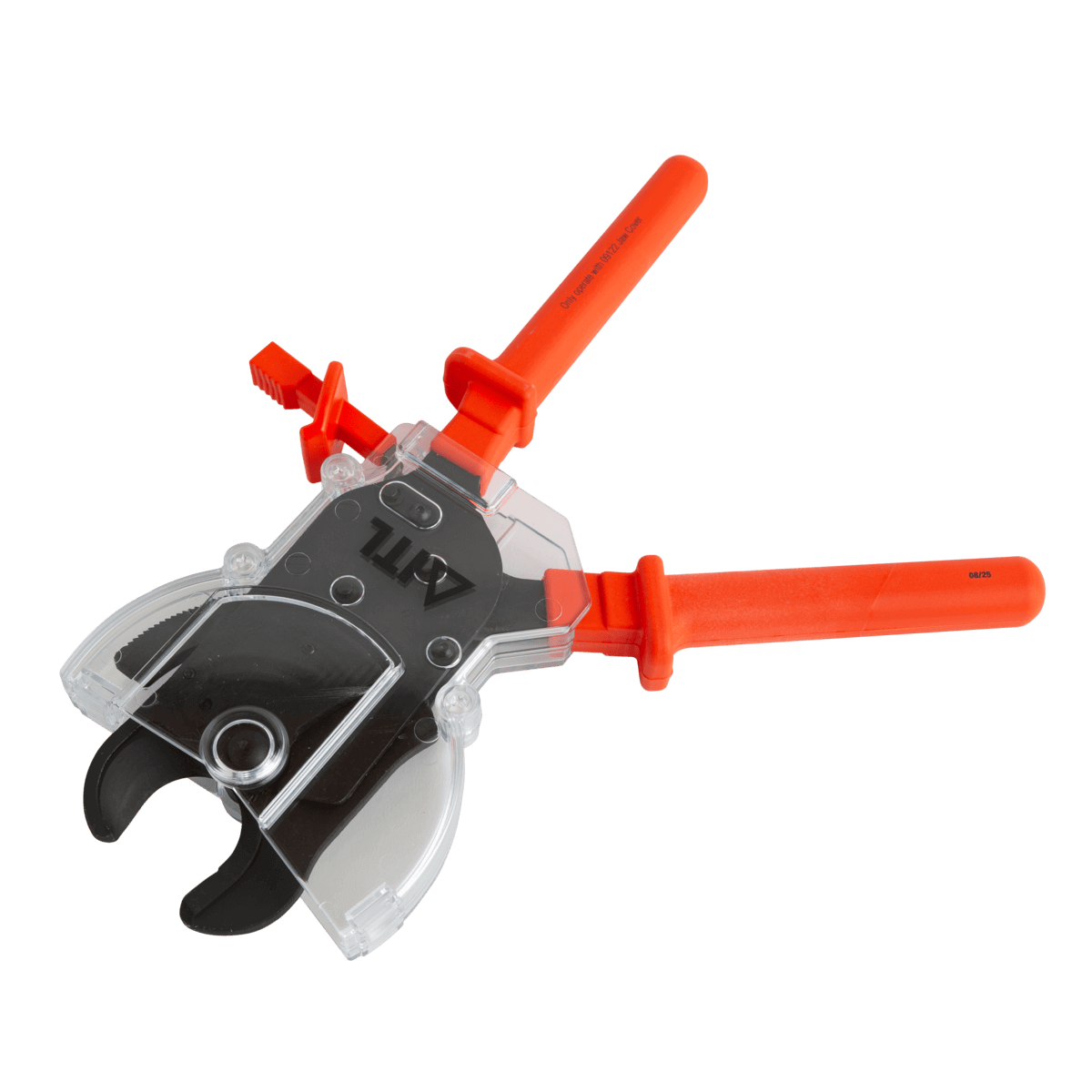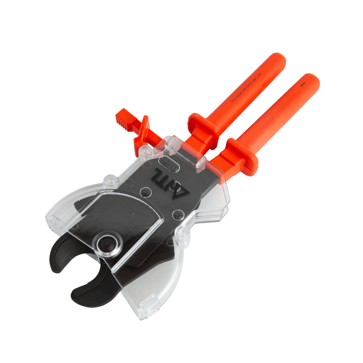1,000v Insulated Ratcheting Cable Cutter for use on solid aluminum and stranded copper cables. Ratcheting mechanism enables the cutting of Ø32mm cables, 320mm² solid aluminum cores and 300mm² copper.