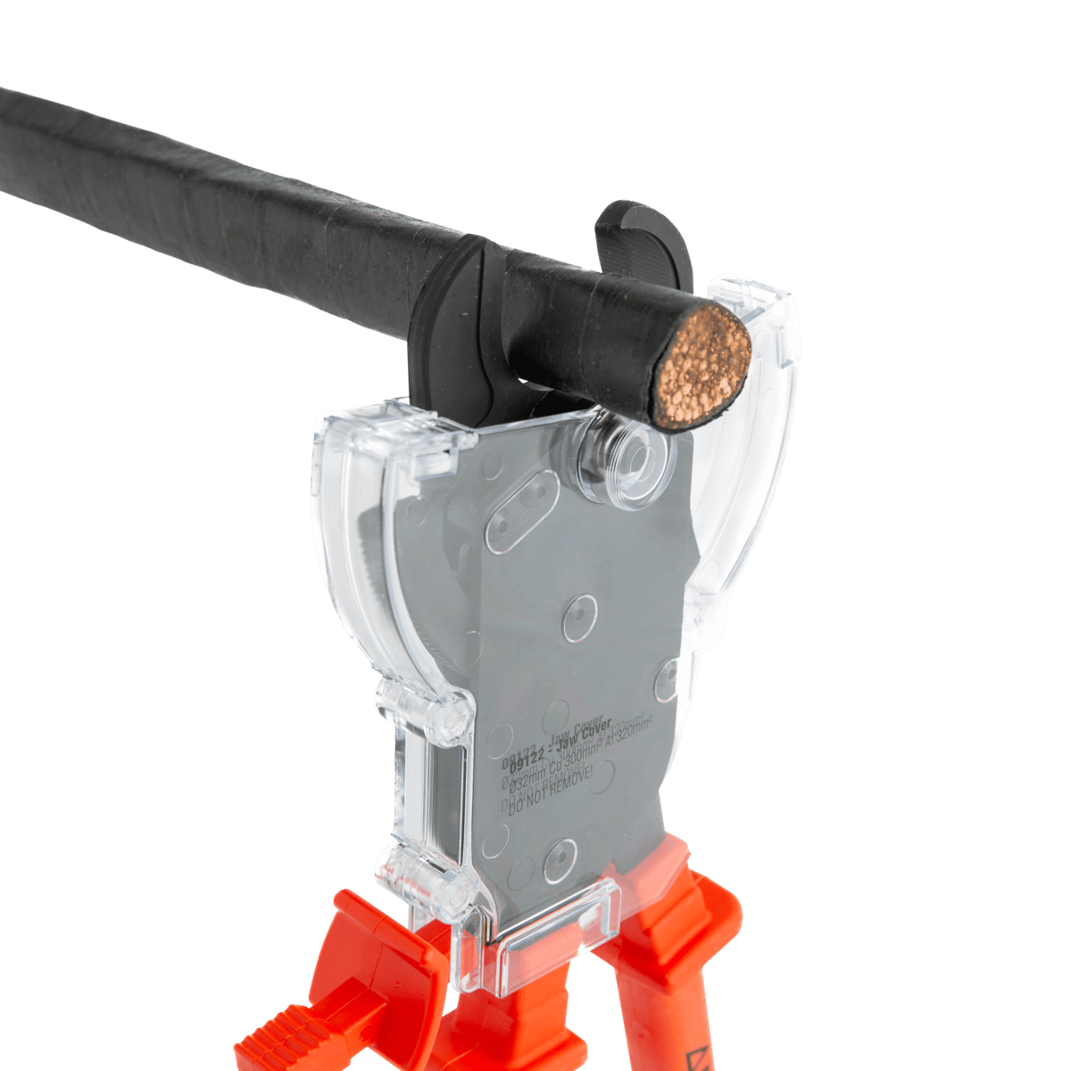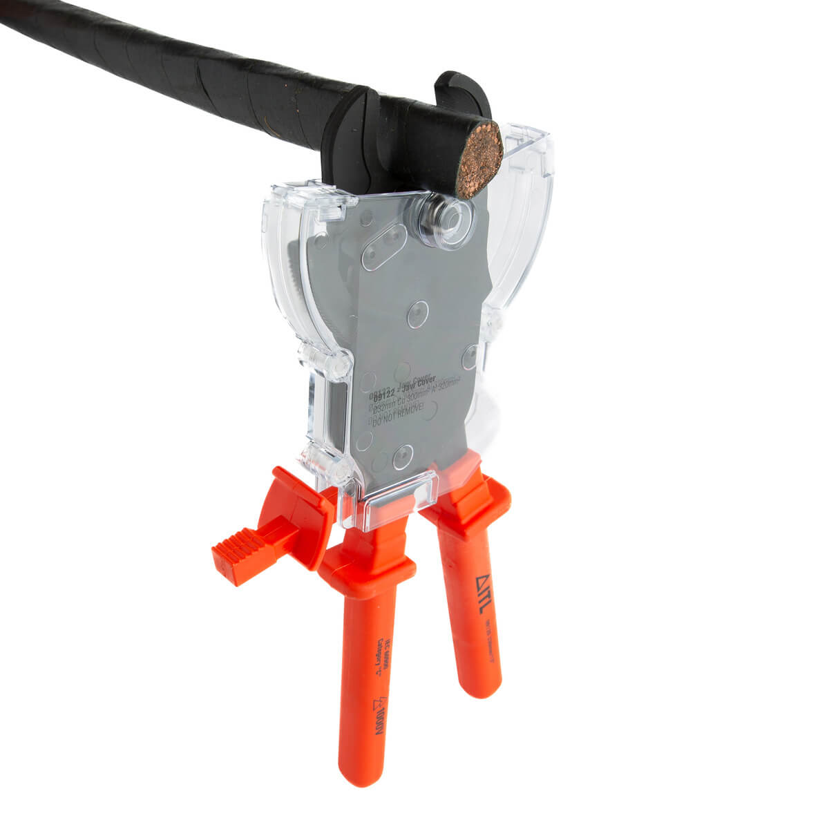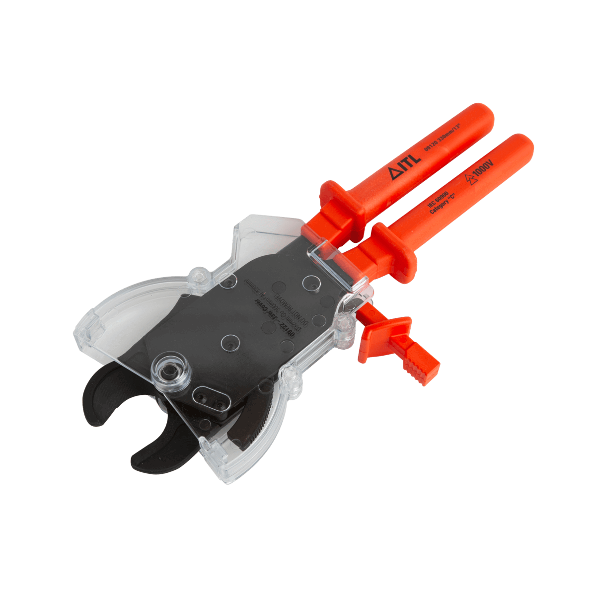 1,000v Insulated Ratcheting Cable Cutter for use on solid aluminum and stranded copper cables. Ratcheting mechanism enables the cutting of Ø32mm cables, 320mm² solid aluminum cores and 300mm² copper.